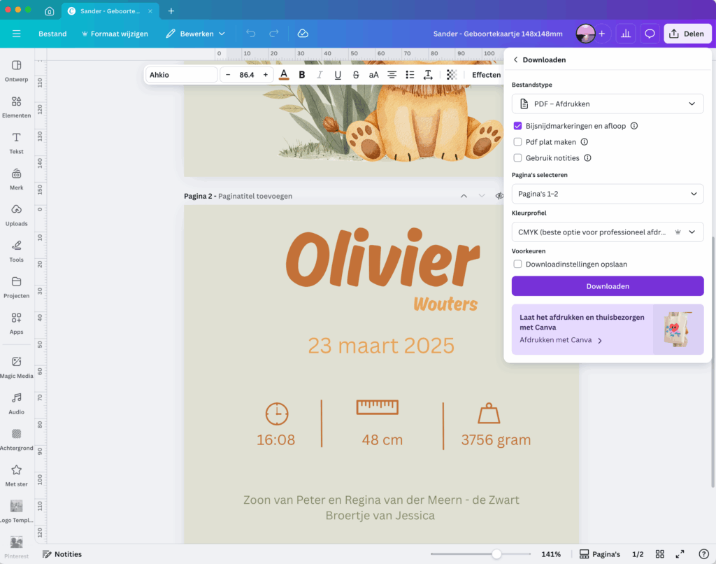 Ben je tevreden met het eindresultaat? Klik rechtsboven op “Delen → Downloaden”, kies PDF – afdrukken, kies voor Bijsnijdmarkeringen en afloop en kies bij kleurprofiel CMYK en sla het bestand op.